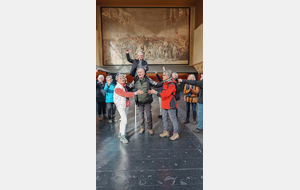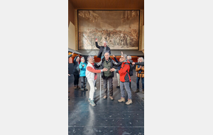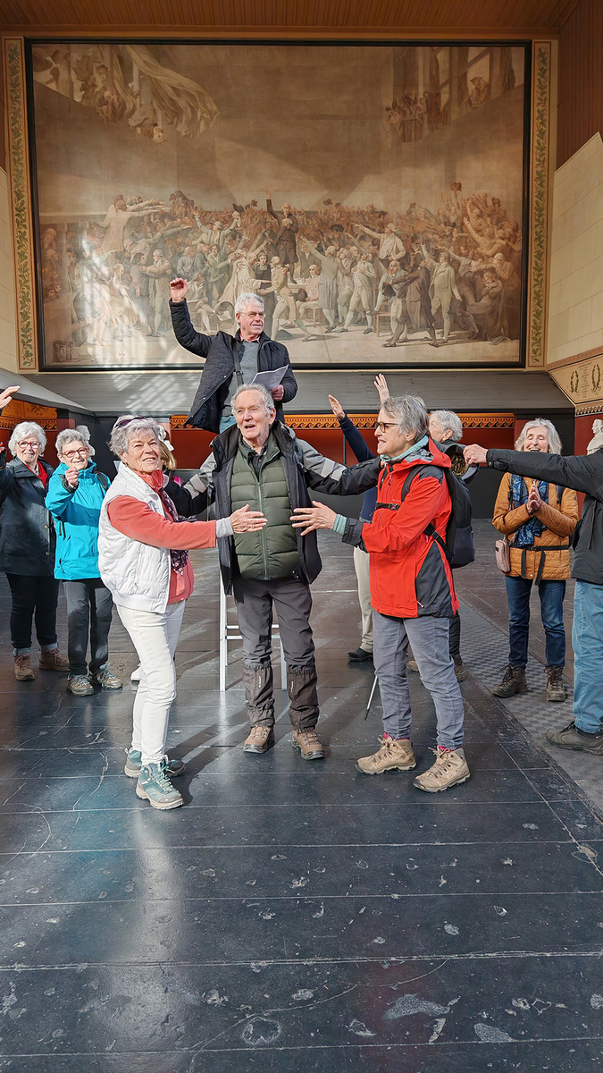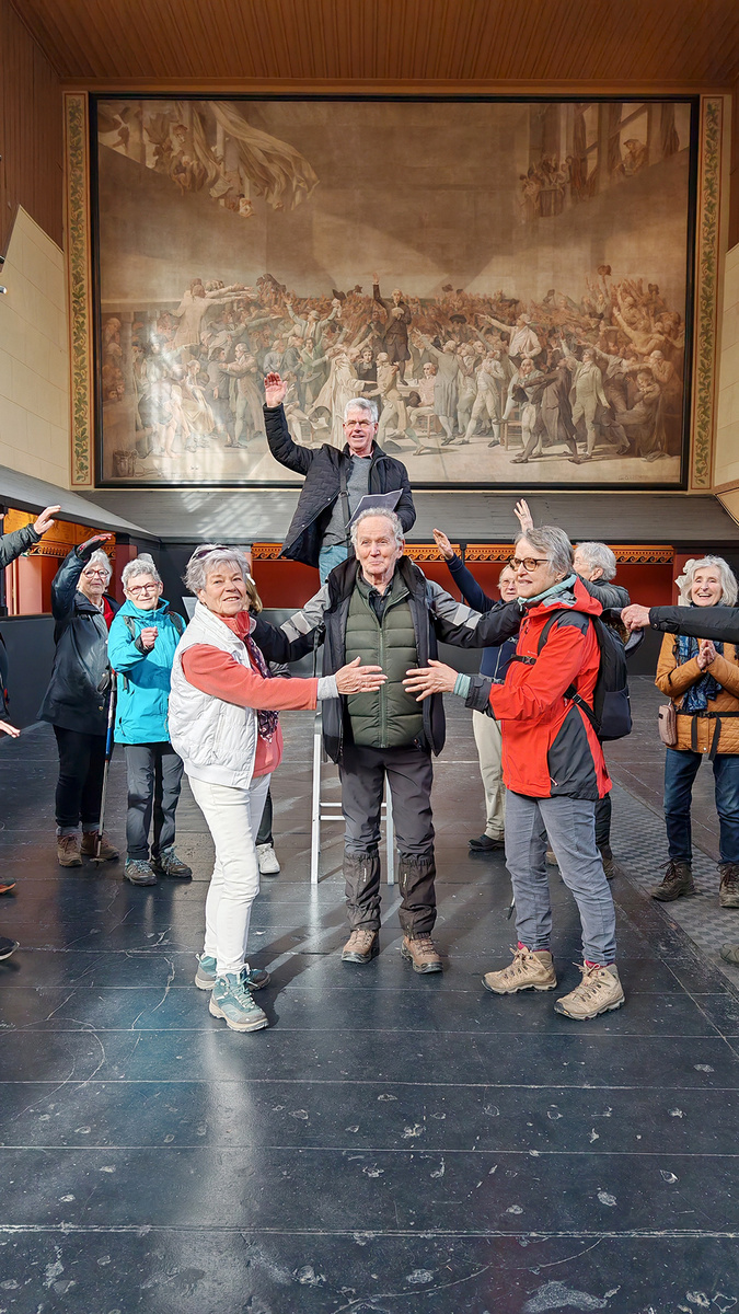 Nous nous apprêtions à partir quand une personne du groupe s’est mise à parler avec l’un des deux gardiens présents. Sans savoir comment nous nous sommes tous regroupés pour écouter ce monsieur retracer avec verbe et humour son enfance à la Réunion et les épisodes qui s’ensuivirent et qui le menèrent jusqu’à Versailles. Nous le remerciâmes et nous nous apprêtions à partir quand, ce monsieur, passionné par l’histoire de France, s’improvisa guide de notre groupe. Nous apprîmes des faits qui se sont déroules dans ce lieu historique. Nous nous apprêtions de nouveau à partir quand il nous proposa de faire des photos en prenant la pose des députés du tableau.